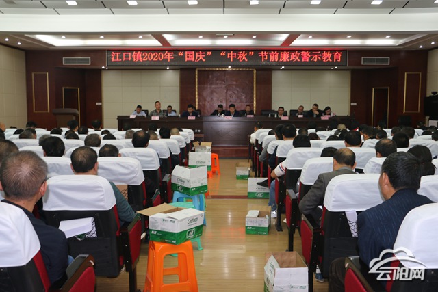 云阳网讯(通讯员 汤小艳)9月29日上午,江口镇召开2020年“国庆”“中秋”节前廉政警示教育会,学习相关文件精神,强调“双节”纪律。全体干部职工、村(社区)四职干部、辖区单位负责人参会。