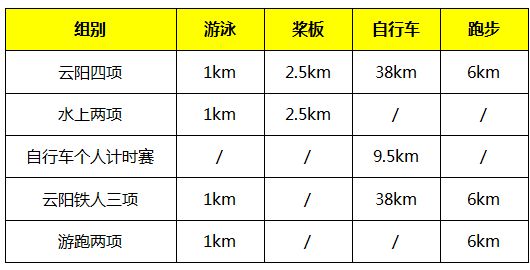 本次赛事包含游泳、桨板、自行车、跑步四个项目,并由云阳四项、水上两项、自行车个人计时赛、云阳铁人三项及游跑两项等五个组别构成,形式丰富多样。