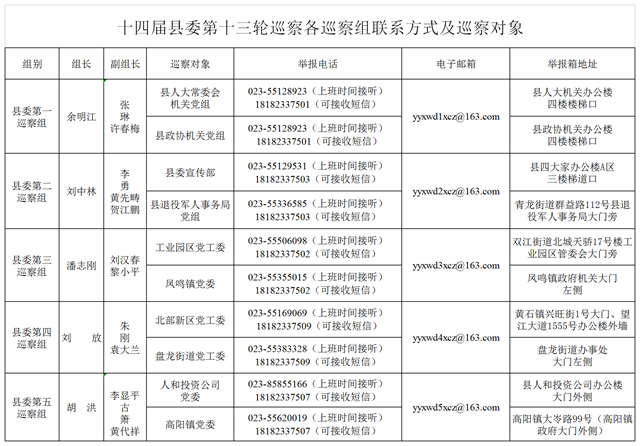 巡察期间,巡察组开通了举报电话和电子邮箱,设置了举报箱,欢迎广大党员、干部、群众反映上述方面的有关情况和问题。对不属于巡察组受理的信访问题,将按规定转相关部门处理。巡察组联系方式及巡察对象详见附表,巡察组受理信访举报截止时间为2020年12月10日18时。