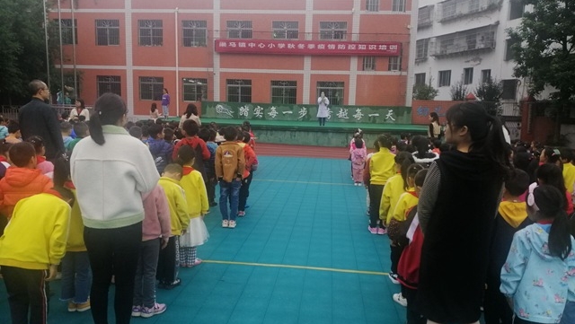 在大操场,主讲医生向师生上大课。她简要介绍了全世界新冠疫情蔓延严峻形势,突出了国家和市县常态化防控工作要求。尤其是结合医院预检分诊工作实践,强调秋冬季节新冠疫情防控难点,抓住重点从洗手、戴口罩、测体温、一米间距等方面如何做,突出了“防”、着力了“控”。倡议全校师生从自身做起,同心协力做好常态化疫情防控。培训活动中,工作人员向师生发放《学校传染病防控知识》和防疫小贴士等知识传单上500份。