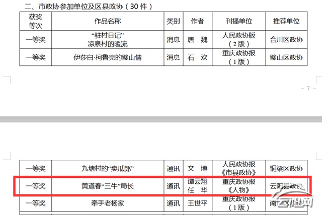 云阳网讯(记者 陈爱玲)日前,从政协重庆市委员会办公厅传来喜讯,云阳县政协谭云翔、云阳县环保局任华撰写的《黄道春:“三牛”局长》,荣获2019年度“重庆市政协好新闻”一等奖。