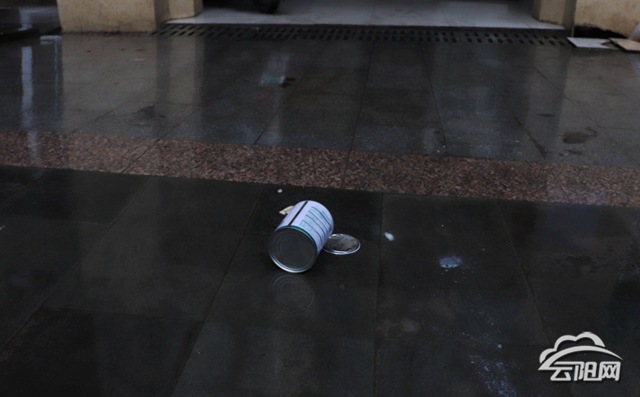 上午11时许,记者现场看到,悠然居小区2号楼入户大厅前的路面上有一个铁罐奶盒,奶粉和盖子散落在一边。