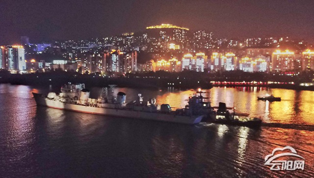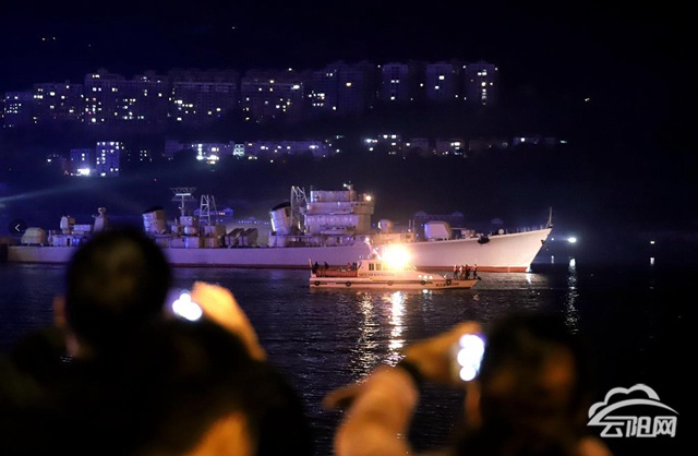 千呼万唤始出来,当天晚上9点,夜幕将航行在长江之上的“珠海舰”披上了一层更加神秘的面纱,尽管已经是“退役老兵”,但威武的风姿在夜色中显得更加威武霸气。在云阳长江大桥上、环湖绿道沿岸,市民们早已等候多时;在城市霓虹的映衬下,珠海舰缓缓驶过,引得沿线市民的阵阵欢呼。