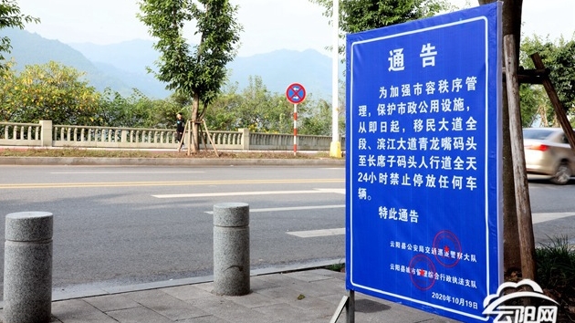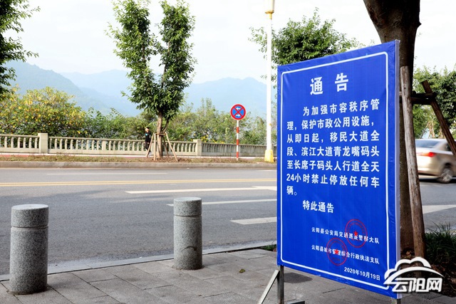 据悉,为加强市容秩序管理,保护市政公用设施,县交通巡逻警察大队和县城市管理综合行政执法支队在近日也特发通告称:从2020年10月19日起,移民大道全段、滨江大道青龙嘴码头至长席子码头人行道全天24小时禁停放任何车辆。