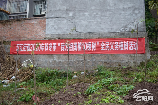 云阳网讯(实习生 瞿利文 肖尧)10月20日,双江街道开展秋冬季“我为祖国种十棵树”活动,社区工作人员与志愿者铲菜复绿,种下一棵棵树苗。