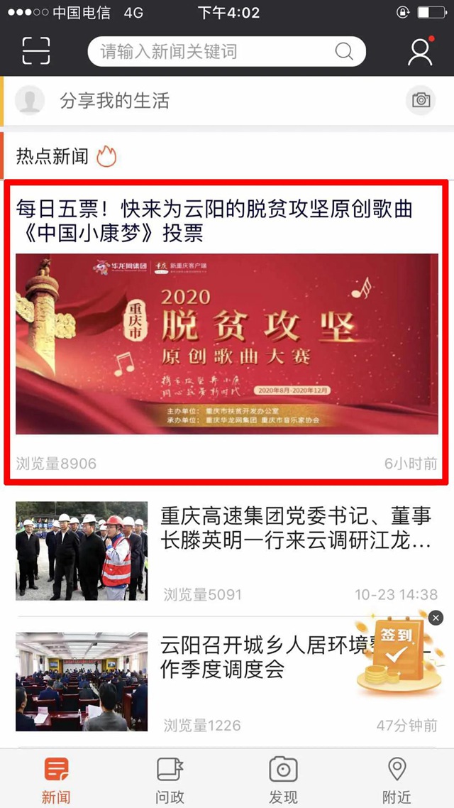 方法一:进入“智慧云阳”APP,点击首页“2020重庆市脱贫攻坚原创歌曲大赛投票活动”新闻,进入投票通道。
