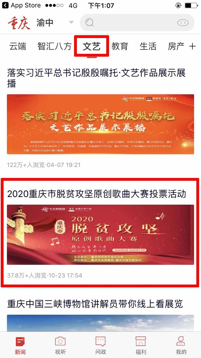 方法二:下载“新重庆”app,注册并登录。进入“文艺”栏目,找到“2020重庆市脱贫攻坚原创歌曲大赛投票活动”(或直接在“新重庆”app搜索栏搜索)。