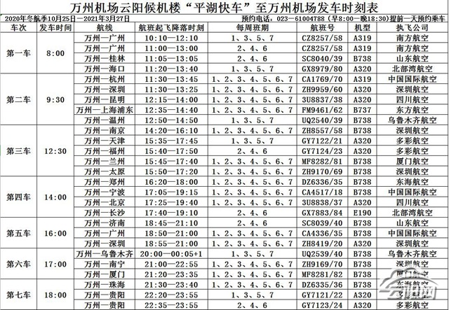 “我们根据机场的航班表,研究机场的出港和到港的航班情况,然后制定班车的时刻表,尽量照顾到大部分旅客,及时将旅客送到万州机场乘坐相关航班。”万州机场相关负责人表示,旅客可提前一天拨打电话023—61004788预约乘车。