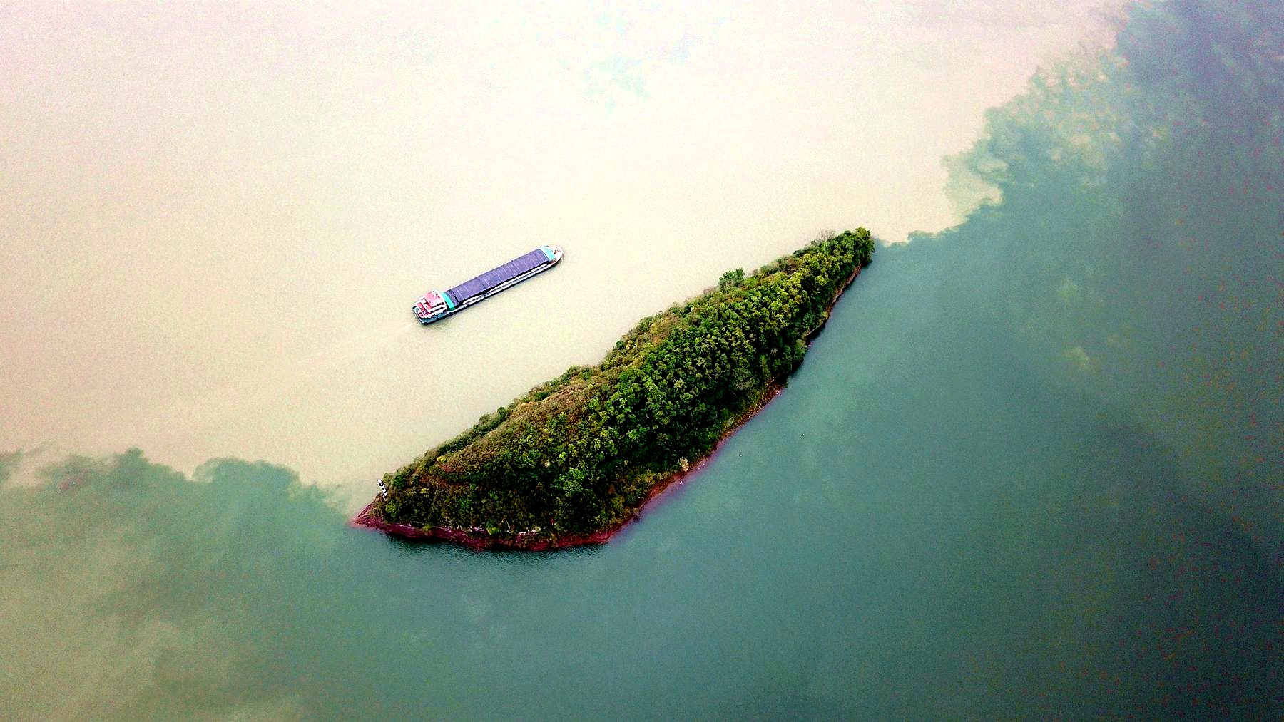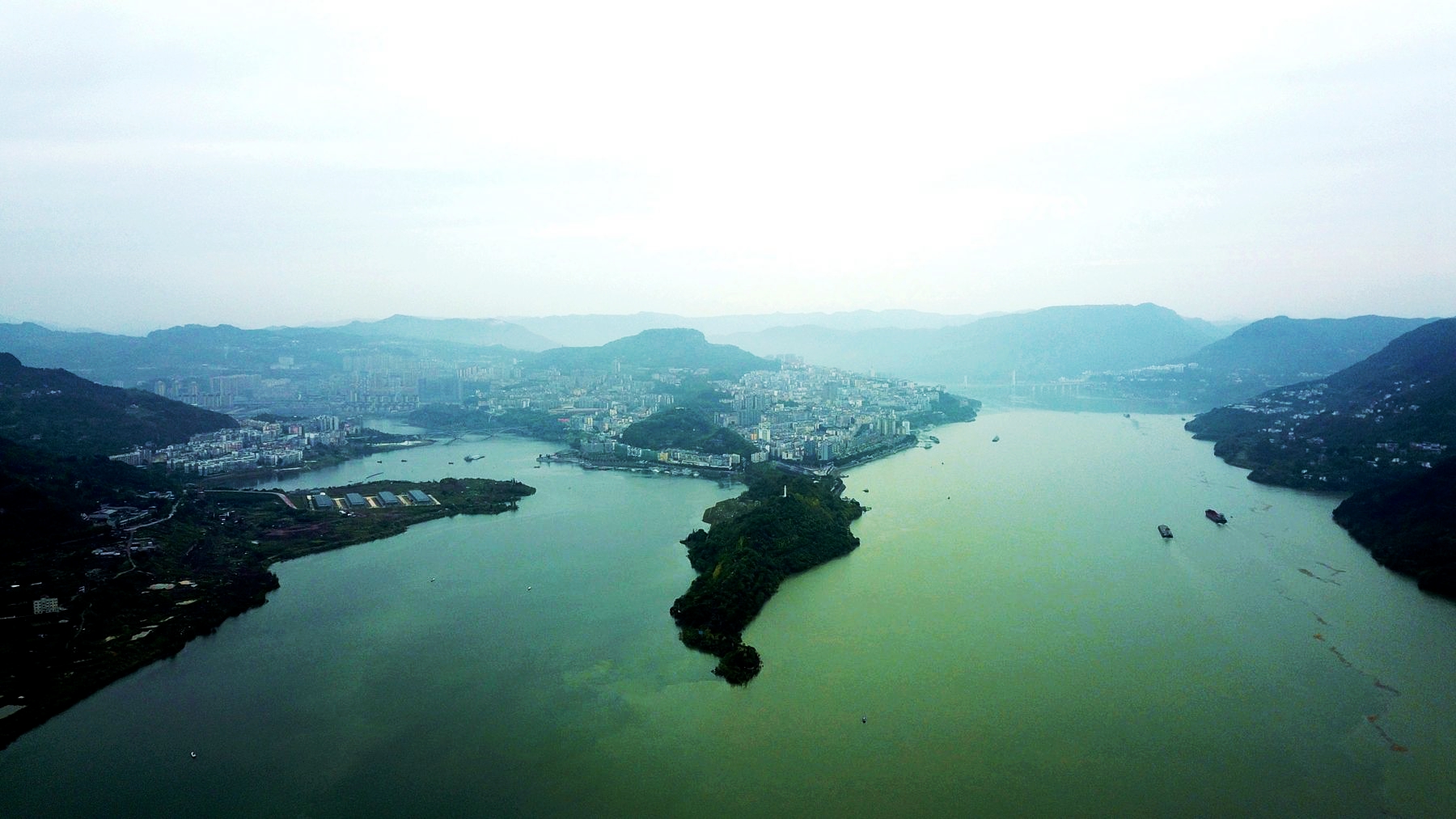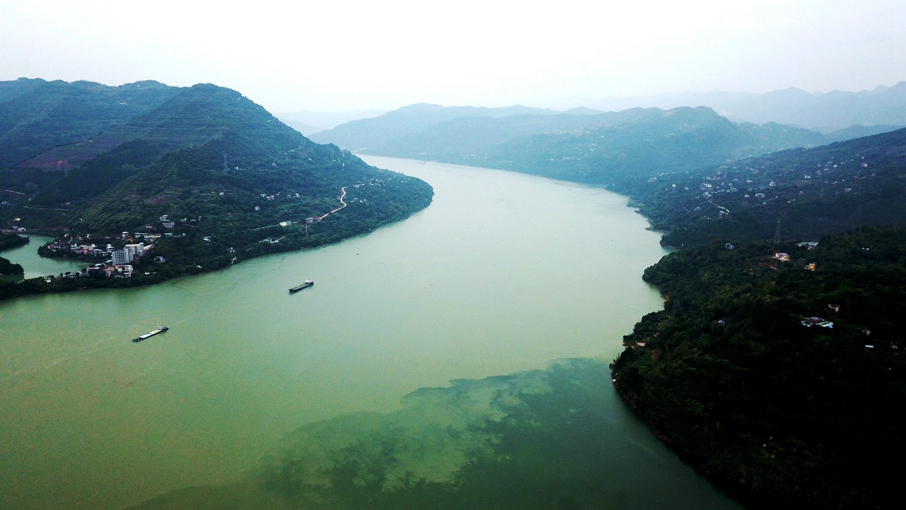 随着三峡工程的蓄水,在双井寨公园,长江与澎溪河交汇处出现“鸳鸯锅”自然景观。江面上,一面黄色一面清色的江水在水域汇合,一清一浊,泾渭分明。(徐磊磊 何竞嘉 摄)
