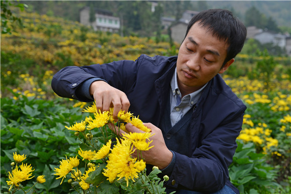 胜利村便民服务中心的旁边是大片花田,村民们正在采摘黄色的菊花。