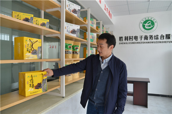 在村支部楼下的展示室,木耳包装盒格外醒目,一起打包成盒的还有金丝黄菊,这些都是胜利村的“硬货”。