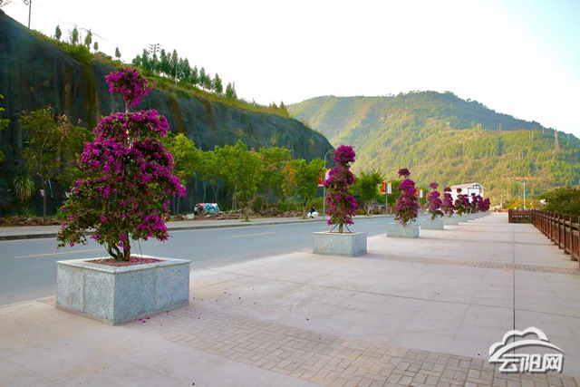 走进南溪镇长洪社区四季大道,能看到道路一侧盛开的三角梅,阳光映衬下的花朵更显红艳,从便民服务中心一直延伸至道路尽头,居民漫步在汤溪河畔,休闲之余,亦能赏花观景,乐在其中。“三角梅花期可从11月起至来年6月,冬春之际,花开姹紫嫣红,能起到美化城镇的作用,为冬季的南溪镇增添一抹艳丽”。规建办主任杨锐介绍到,所选择的三角梅颜色为紫红、大红,在长洪社区入口、四季大道、政府广场和汤溪农贸市场活动中心共栽有70棵,不同颜色的三角梅深受居民喜爱。
