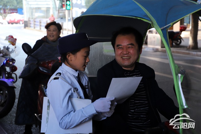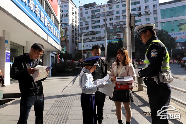 云阳网讯(记者 朱学徽 实习生 李歆宇)11月13日,在城区云江大道部分人行横道交通路口,“大交警”带着“小交警”发放宣传单,耐心引导市民文明出行,遵守交通规则。