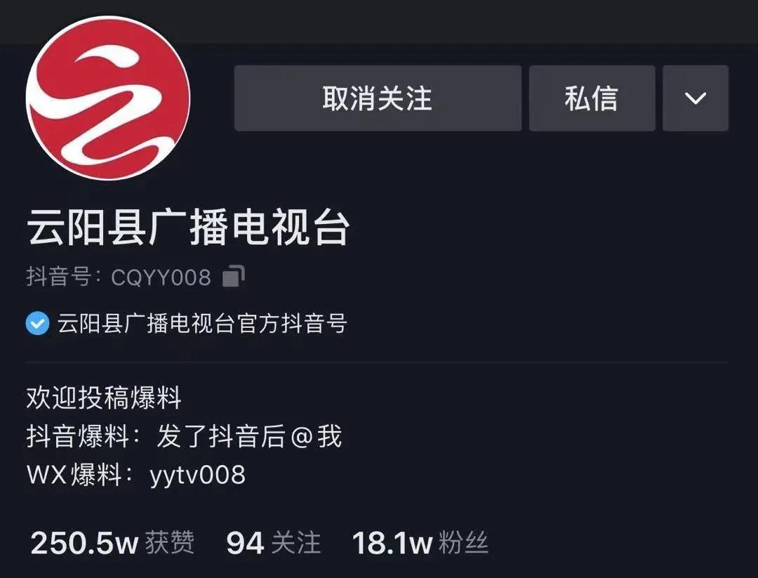 云阳县广播电视台抖音号:CQYY008,目前发布作品439条,获赞250.5万。