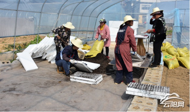 图为正在新建的温室大棚里翻土、播种、摆盘