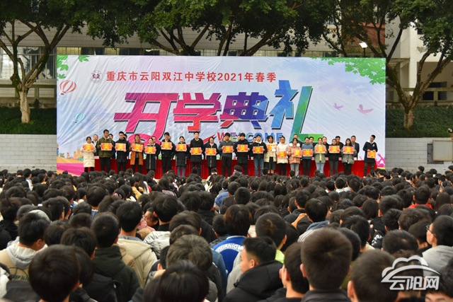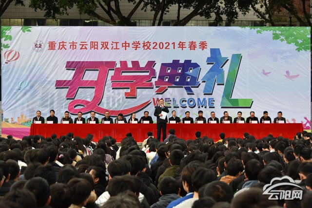 云阳网讯(通讯员 陈垣廷)3月2日,云阳双江中学校全体师生在操场举行隆重的开学典礼。典礼在庄严的国歌声中拉开序幕。师生们庄严肃穆,面向国旗唱国歌,行注目礼。
