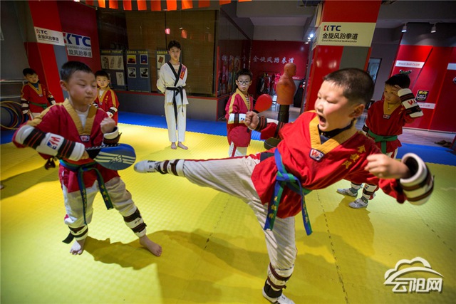 3月14日,在金旋风跆拳道馆,教练员的哨音和口令一发出,学员们的声音洪亮,响彻整个跆拳道馆,动作整齐划一,动作有板有眼。