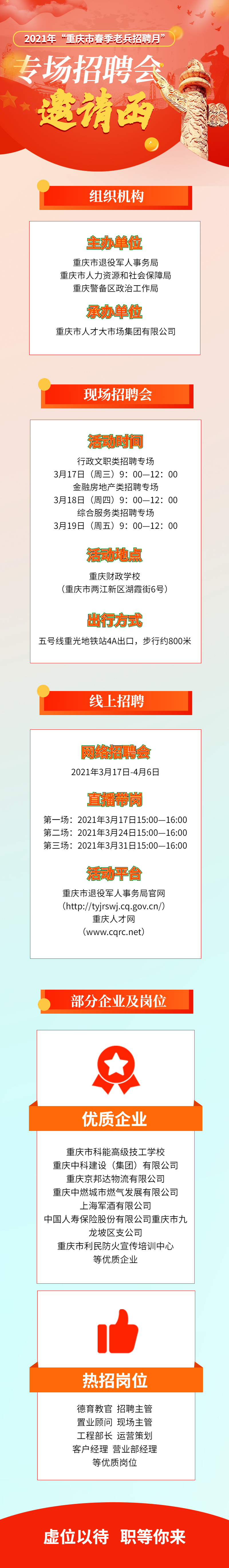 据悉,本次活动将以“现场招聘会+网络招聘会”的形式结合开展,现场招聘会分为行政文职类、金融房地产类和综合服务类三场,将于3月17日、18日、19日依次进行,活动地点为重庆市财政学校。线上活动将在重庆市人才网举行,每周将开展一次直播带岗活动。