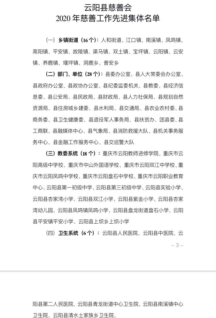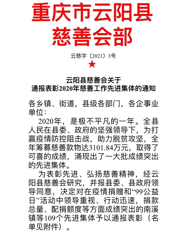 通报指出,为表彰先进、弘扬慈善精神,经云阳县慈善会研究,并报县委、县政府领导同意,对过去一年在疫情捐赠和“99公益日”活动中领导重视、行动迅速,捐款总量、配捐额度等方面成绩突出的南溪镇等109个先进集体予以通报表彰。其中包括: