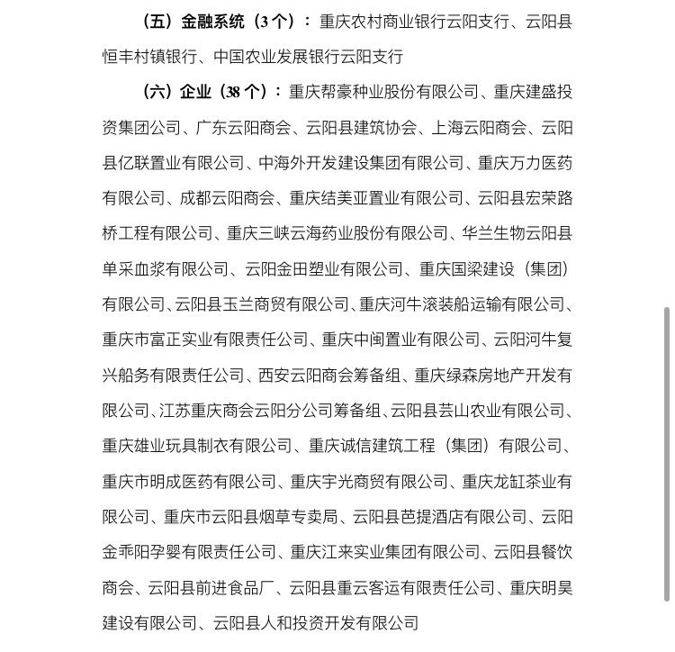 企业38个:重庆帮豪种业股份有限公司、重庆建盛投资集团公司、广东云阳商会、云阳县建筑协会、上海云阳商会、云阳县亿联置业有限公司、中海外开发建设集团有限公司、重庆万力医药有限公司、成都云阳商会、重庆结美亚置业有限公司、云阳县宏荣路桥工程有限公司、重庆三峡云海药业股份有限公司、华兰生物云阳县单采血浆有限公司、云阳金田塑业有限公司、重庆国梁建设(集团)有限公司、云阳县玉兰商贸有限公司、重庆河牛滚装船运输有限公司、重庆市富正实业有限责任公司、重庆中闽置业有限公司、云阳河牛复兴船务有限责任公司、西安云阳商会筹备组、重庆绿森房地产开发有限公司、江苏重庆商会云阳分公司筹备组、云阳县芸山农业有限公司、重庆雄业玩具制衣有限公司、重庆诚信建筑工程(集团)有限公司、重庆市明成医药有限公司、重庆宇光商贸有限公司、重庆龙缸茶业有限公司、重庆市云阳县烟草专卖局、云阳县芭提酒店有限公司、云阳金乖阳孕婴有限责任公司、重庆江来实业集团有限公司、云阳县餐饮商会、云阳县前进食品厂、云阳县重云客运有限责任公司、重庆明昊建设有限公司、云阳县人和投资开发有限公司。