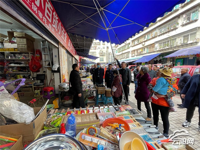 在莲花市场,执法人员对占道经营、车辆乱停乱放、无证经营、自设遮(阳)雨帽存在消防安全隐患、环境卫生问题等情况进行排查。
