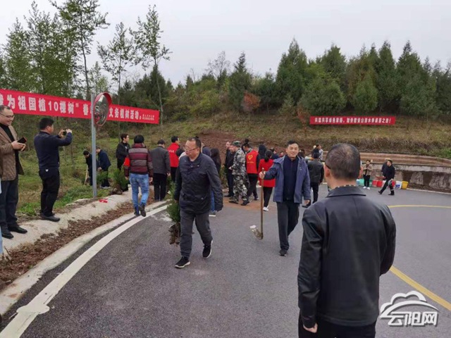 植树现场,旗帜飘扬,大红横幅标语,喇叭声、挥动锄头挖地声、同志们欢声笑语,扶苗、栽植、压实,浇水,拍照一派繁忙景象,栽下的柏树苗沐浴着阳光……同时,腾龙村、旺龙村、帽合村、亲睦村等结合乡村振兴、绿色示范村创建栽上了楠木,三角梅、山胡椒等绿化美化苗木,全面展开面上全民义务植树活动。