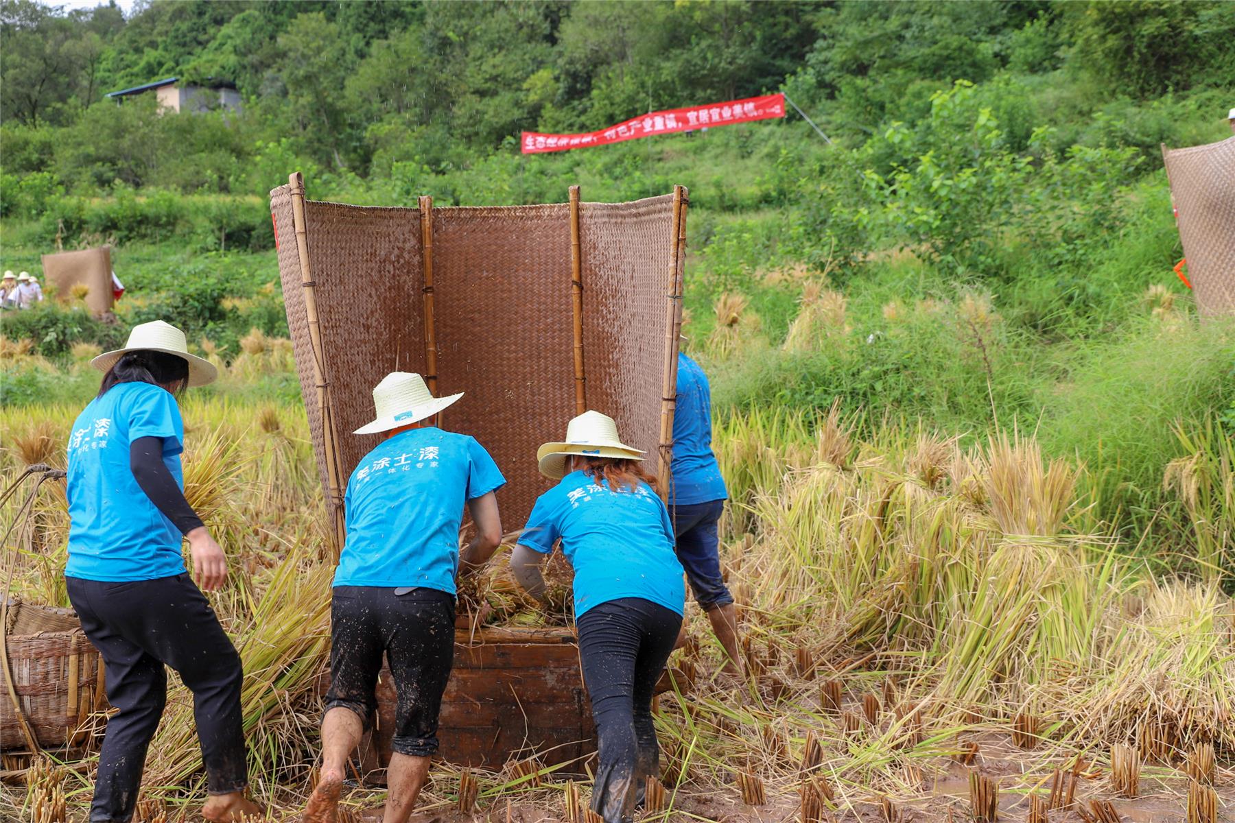 除了传统的割稻、打谷比赛外,当地还将直播间搬到了稻田边,通过本土网红现场直播,为特色农产品带货。