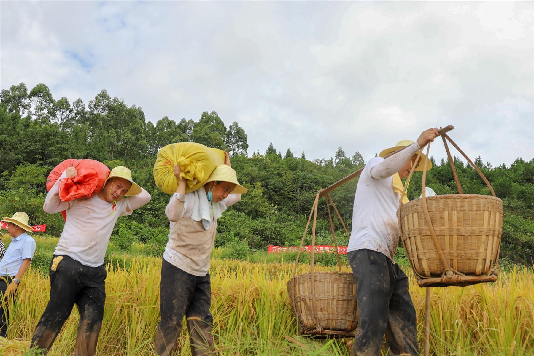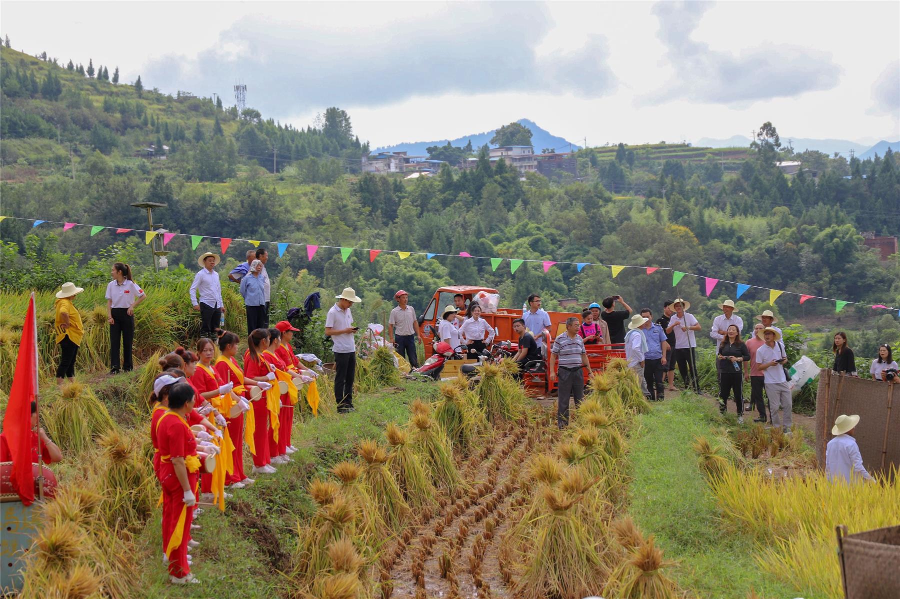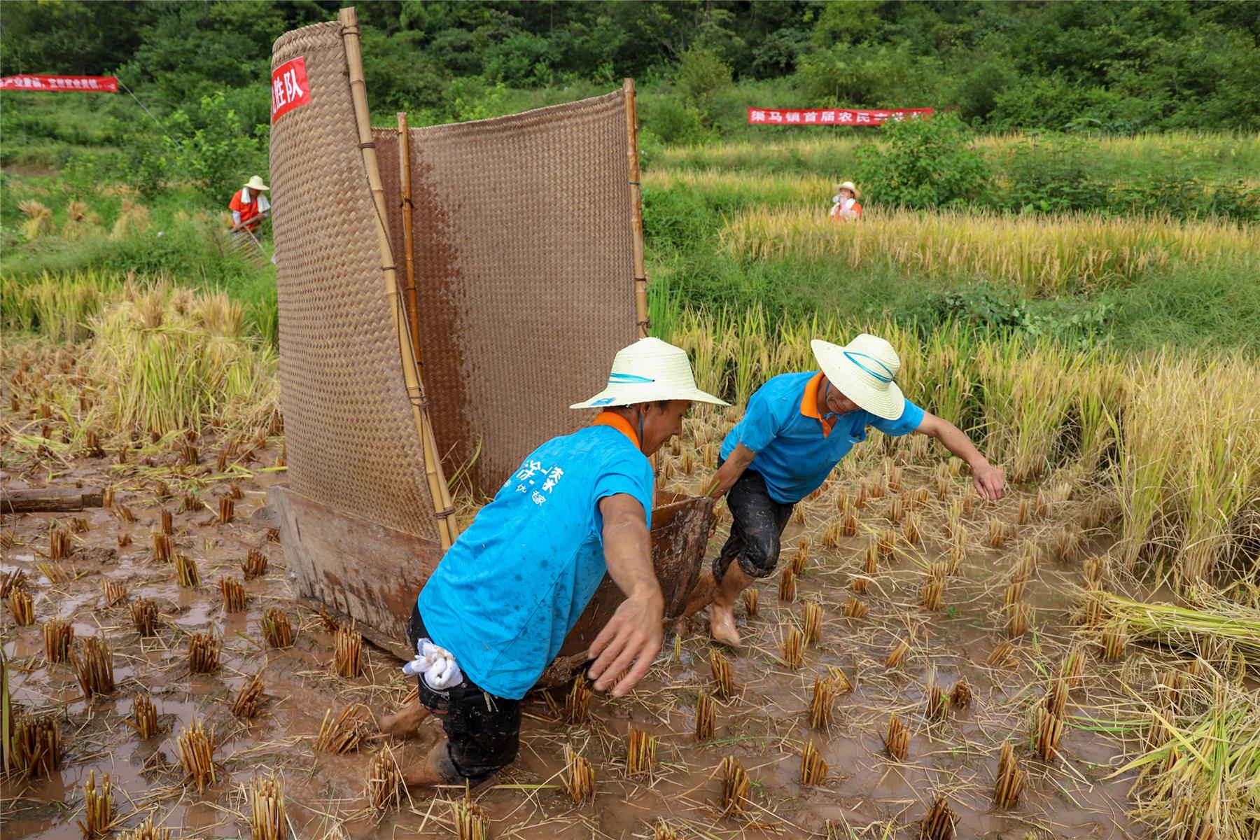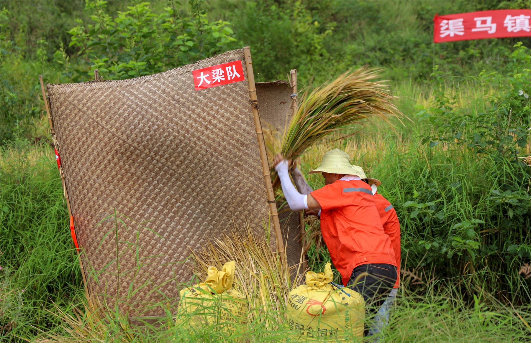 比赛现场,数百亩稻田一片金黄,沉甸甸的稻穗随风摆动,掀起层层金浪。由当地村社区、学校、卫生院组成的14支参赛队伍的队员们手持镰刀,挽着裤脚,忙着收割、捆扎、翻打新稻,村民们默契协作。渠马镇渠马小学负责人一边收割稻谷一边说道:“农村生活是比较辛苦的,劳动也很艰辛,但我们从割稻、打谷子比赛中,不仅体会到了丰收的喜悦,也感受到了劳动成果带来的快乐。”