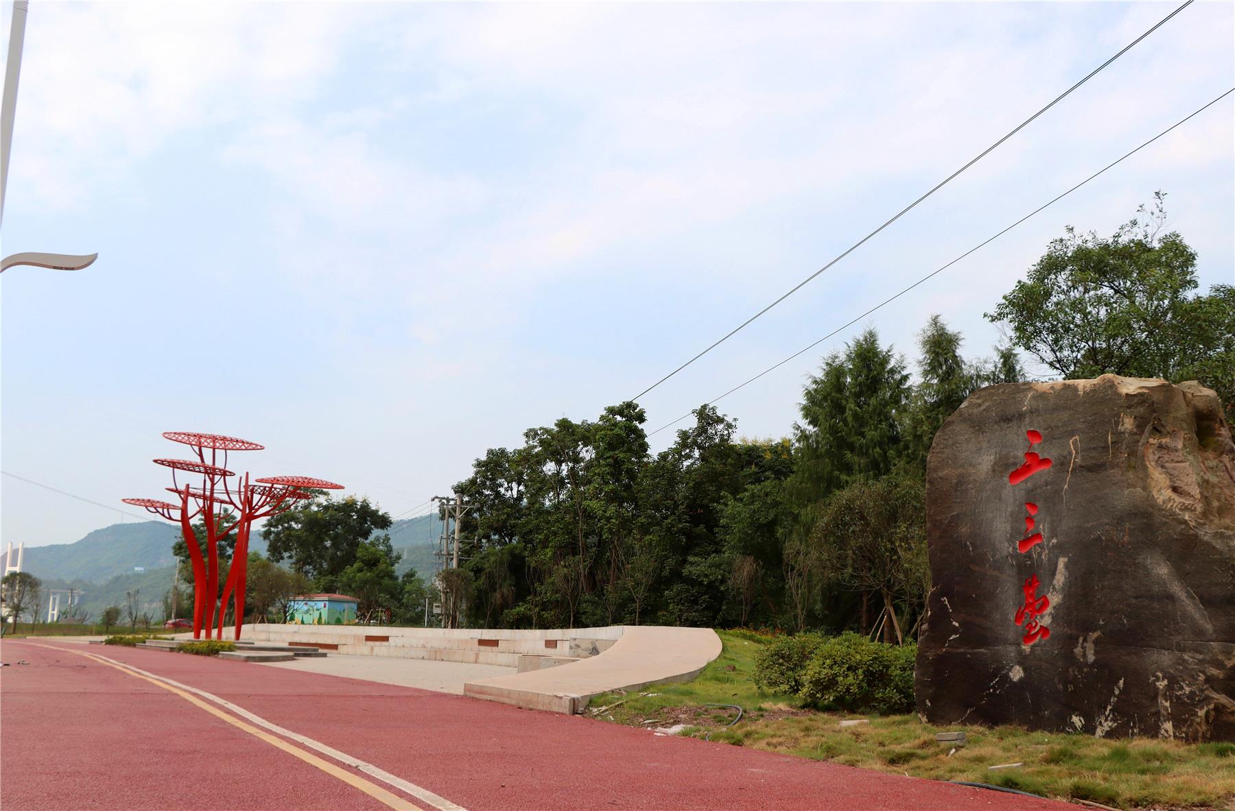 沿着白兔井观景平台一直向前,左侧山清水秀,右侧车水马龙,徜徉于环湖绿道上,舒畅之感一半归于身体,一半归于心灵。不知不觉间,一处亮红的大树造型景观便映入眼帘,再稍稍往前,一块巨大的石头上印刻着“三三台”三字,此处便是环湖绿道终点——三三台观景平台,由此抬眼望去,郑万高铁云阳站显得格外耀眼。