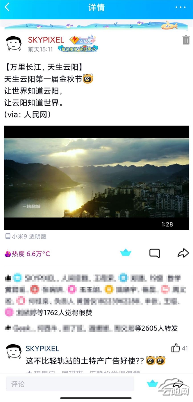 为了更好地” 让世界知道云阳,让云阳知道世界”,9月23日,一名在外求学的云阳籍学子,发布了一条附有文字和视频的说说,短短两三天时间,瞬间引爆了他原本安静的QQ空间,获得了 1762次点赞、2605次 转发、6.6万次浏览。