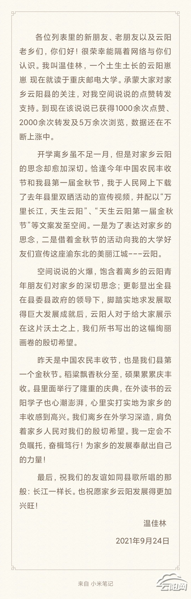 “县里面举行了隆重的庆典,在外读书的云阳学子也心潮澎湃,心里实打实地为家乡的丰收感到高兴……”9月24日,温佳林专门写了一篇文章,既感谢大家的认可,又抒发了自己对家乡的热爱以及为家乡取得的巨大成就和变化而无比骄傲自豪。