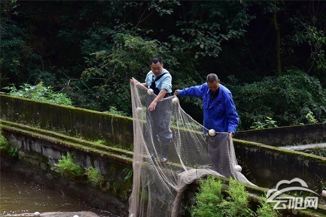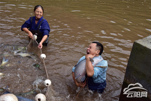 “这个大青鱼有十多公斤哟,我抱都抱不住!”深秋时节,在高阳镇青树村的水塘里,云阳县渔公农业开发有限公司总经理温定军和村民正一起热火朝天地网鱼,网收紧后,肥美的大青鱼、草鱼、翘壳鱼不停翻腾跃跳,引起水花四溅,温定军开心地抱起一条大青鱼向记者展示。