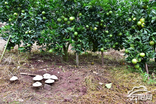 此外,记者还在柑橘地里看到许多蘑菇开得正盛,原来,这也是柑橘地提质增效的一个亮点。通过在树底埋上菌渣,柑橘长得又多又大又甜。