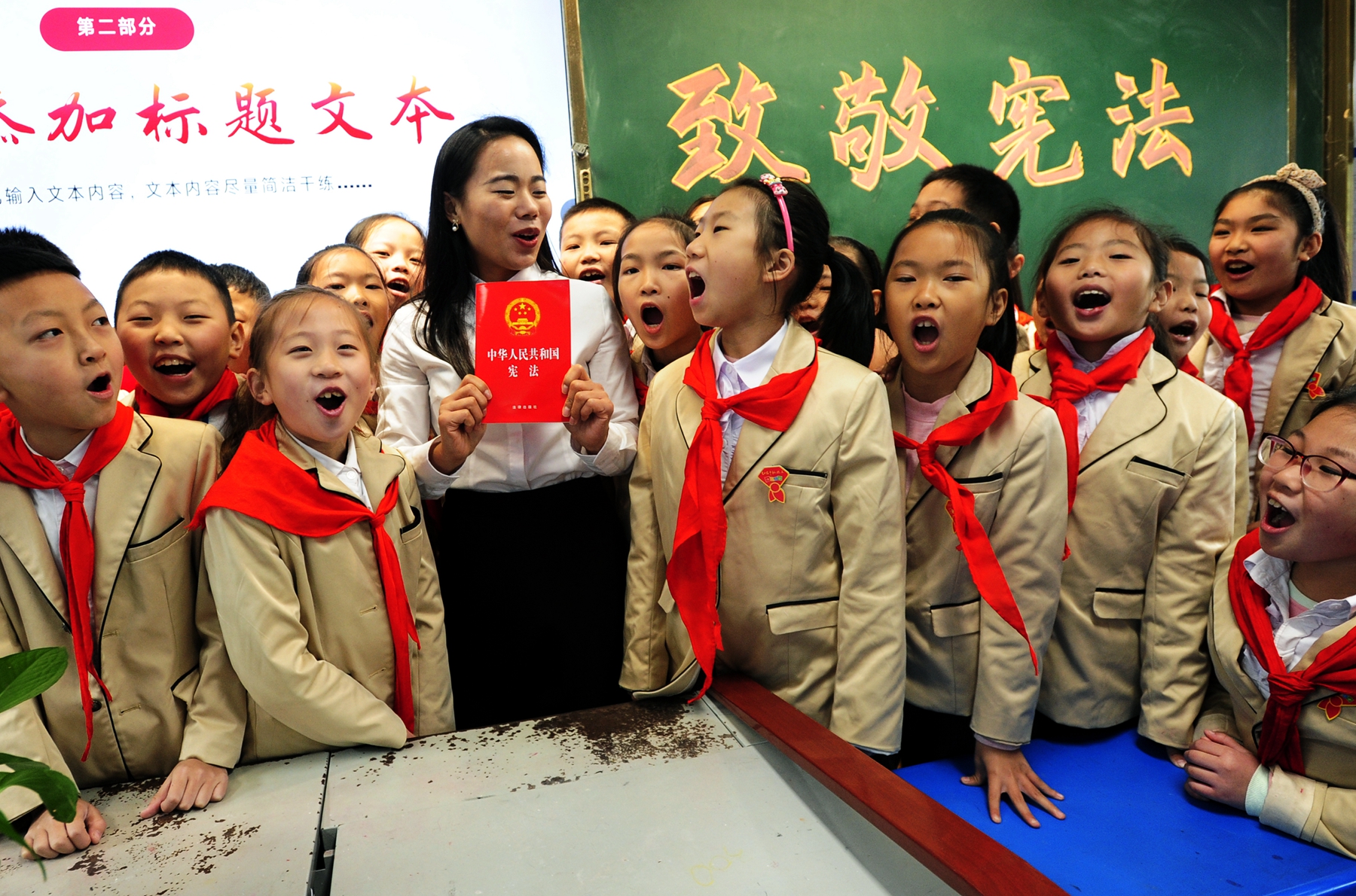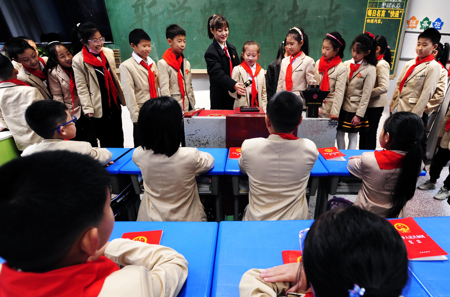法官们走进校园后,与辅导老师一起,采取讲授《宪法》知识,开展《宪法》晨读,认识法徽法袍,体验敲击法槌,模拟《宪法》宣誓等多种兴趣活动,让小朋友们深入了解国家法治的基本模式与推动进程,从小树立法治文明思想,自觉学习法律规范,遵从国家法治建设。昨天,我们仰望《宪法》,无数先烈筚路蓝缕、赴汤蹈火建国立国呼唤出了《宪法》;今天,我们致敬《宪法》,是因为《宪法》的生命力在于实施,作用力在于服务人民;明天,我们信仰《宪法》,基于《宪法》属于治国安邦的总章程,民族复兴路上的航标灯,人民有信仰,国家有力量,民族才有未来!