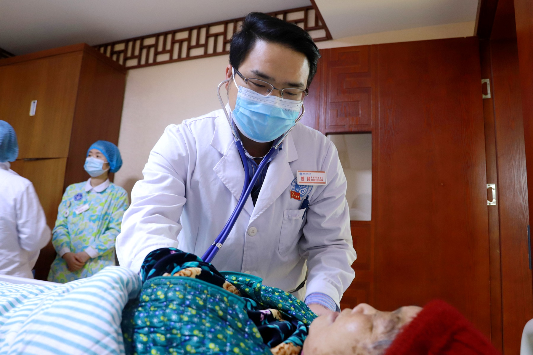 在另一个病房内,来自云阳镇的余先生正在病床前悉心照顾母亲胡大银。看到曾闯和同事前来查房,他连忙起身报以微笑。