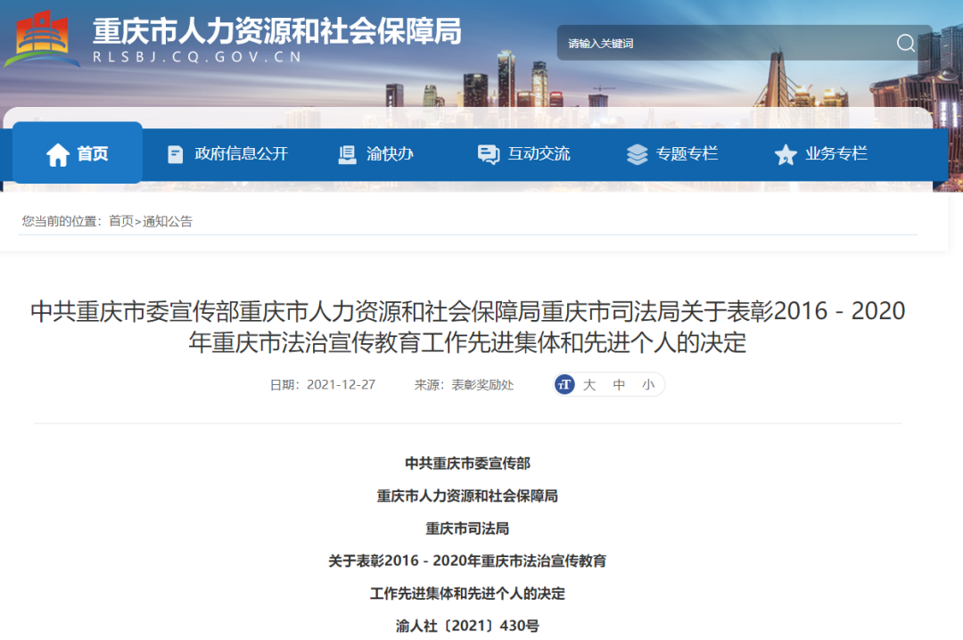 荣获2016—2020年重庆市法治宣传教育工作先进个人