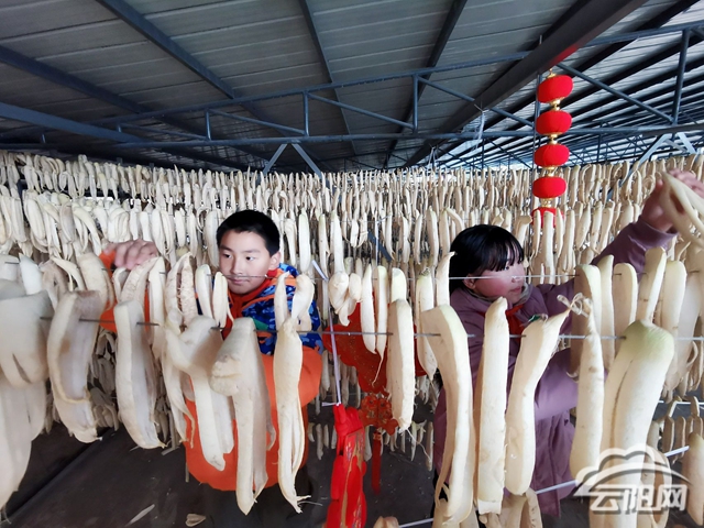 “走,我们晾晒去!”在辅导老师的指导下,孩子们分成两人一组,抬着筐里切好的萝卜条,小心翼翼地挂在车间里一排排铁丝上。大家跃跃欲试,还不时地向工人讨教方法。