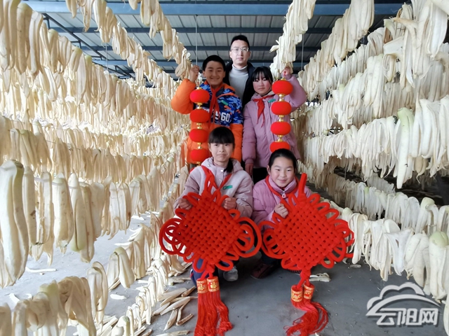 “同学们,我们与风萝卜合个影!”在二楼车间,刘剑忙着招呼在收获晾干的萝卜条的同学。“咔嚓,OK!”几个少先队员在狭长的“巷道”里,手提着中国结和红灯笼,与鲜艳的红领巾交相辉映,摄影师记录下了这幸福快乐的时刻。