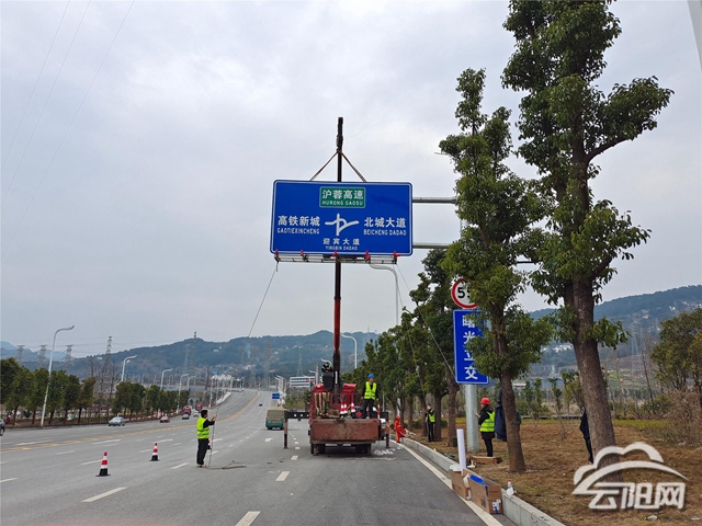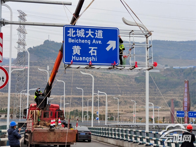 在曙光立交处,施工人员操作吊车将一块崭新的道路交通标识牌缓缓吊起安装。不一会,一块带有高铁新城和北城大道字样的标识牌便安装完毕。与之前的路牌相比,新更换的标识牌内容更为完善,指向也更为精准,大大提升了城市的形象和品位。