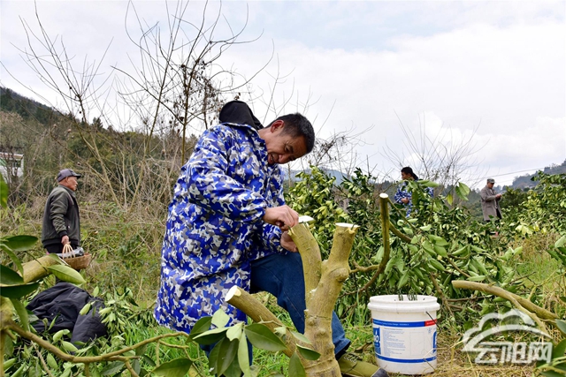 养鹿镇养鹿社区麻柳塘柑橘园种植有770亩在春季采摘的晚熟柑橘,但受地势影响易遭冻害,在县农业农村委指导下,当地引进了新品种“龙回红”。惊蛰节气后,气温回升,有助于新枝条快速成活生长,当地便抢抓有利时机开展嫁接。