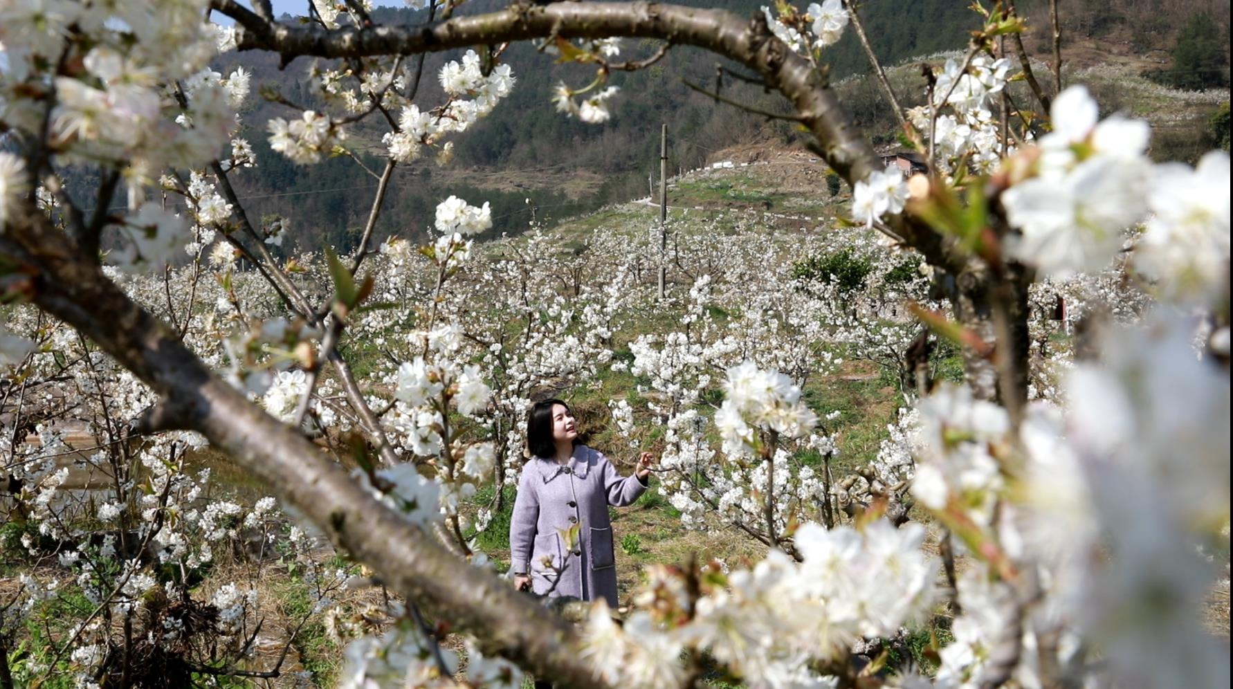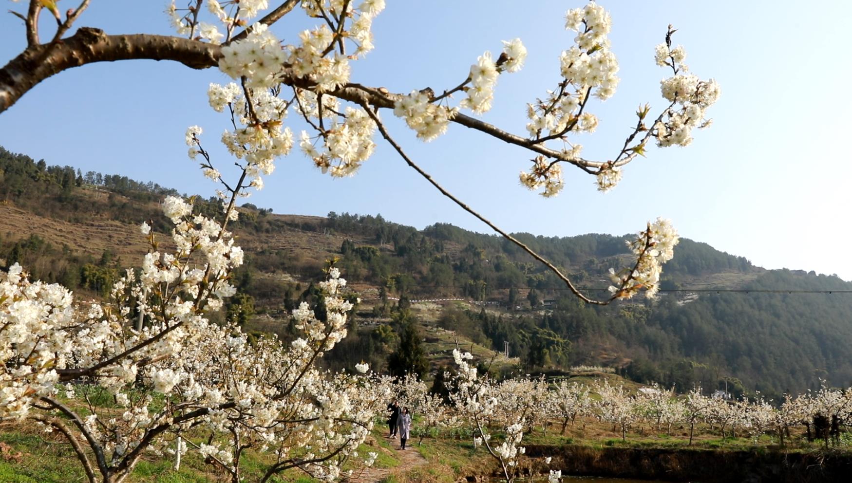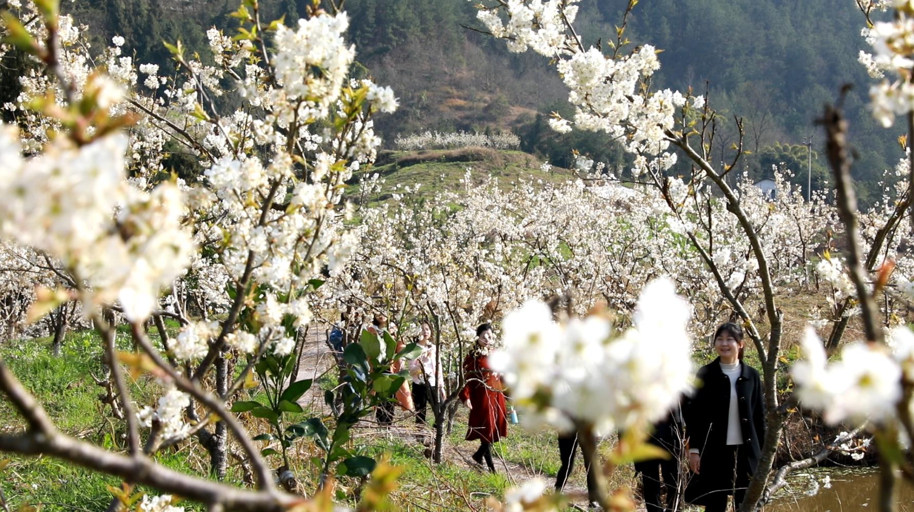 樱桃千万枝,照耀如雪天。沿着蜿蜒的山路行至樱桃园,一片片雪白映入眼帘,花林深处,民房错落有致,恍入世外桃源。一树一树的晶莹,一枝一枝的花团,挤挤挨挨,密密匝匝,在蓝天下尽情盛开。花束间,蜜蜂飞舞,蝴蝶翩跹。春日盛景也吸引了不少慕名而来的游人,大家徜徉在花海间,拍照留影,拥抱春光。