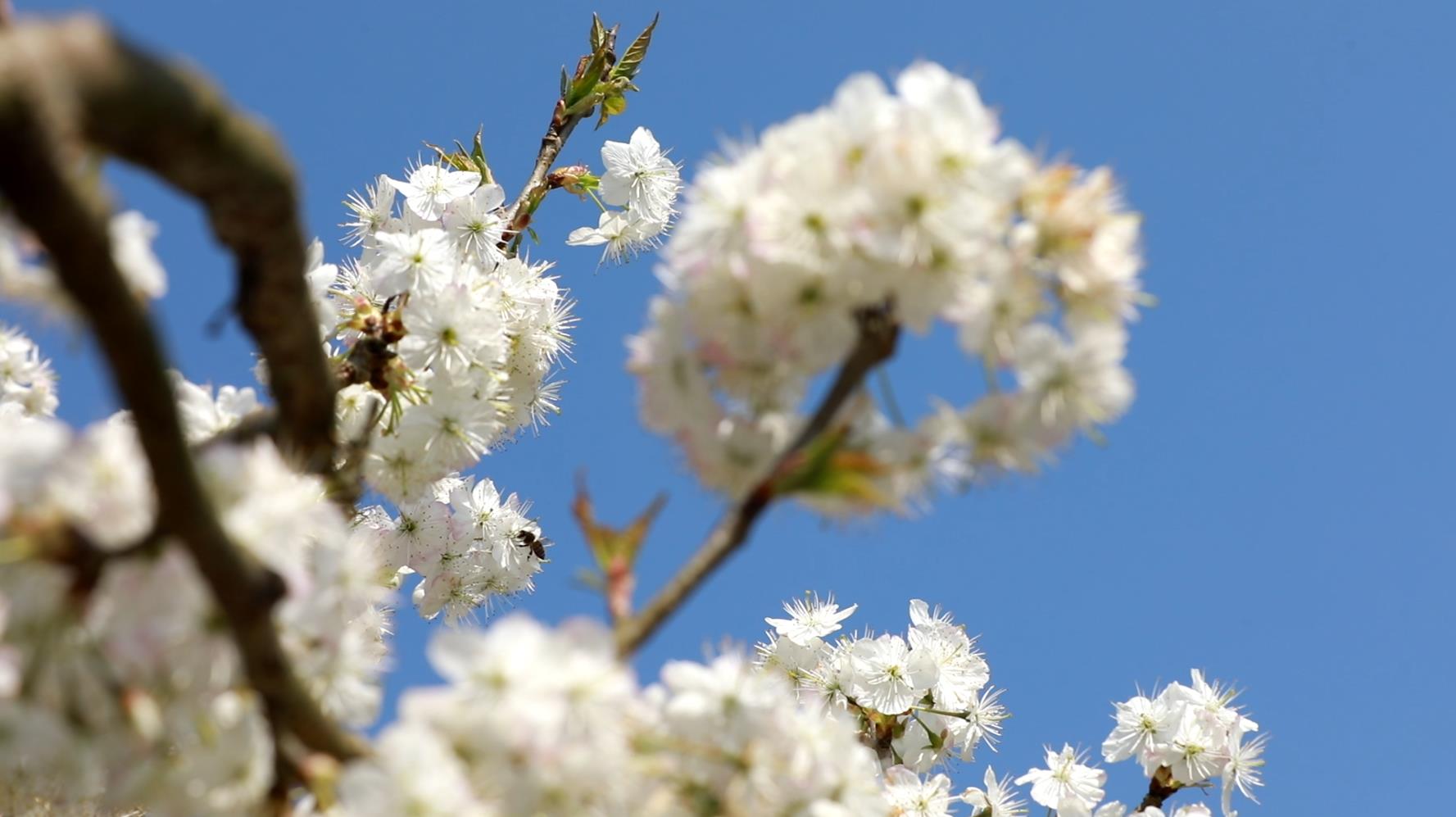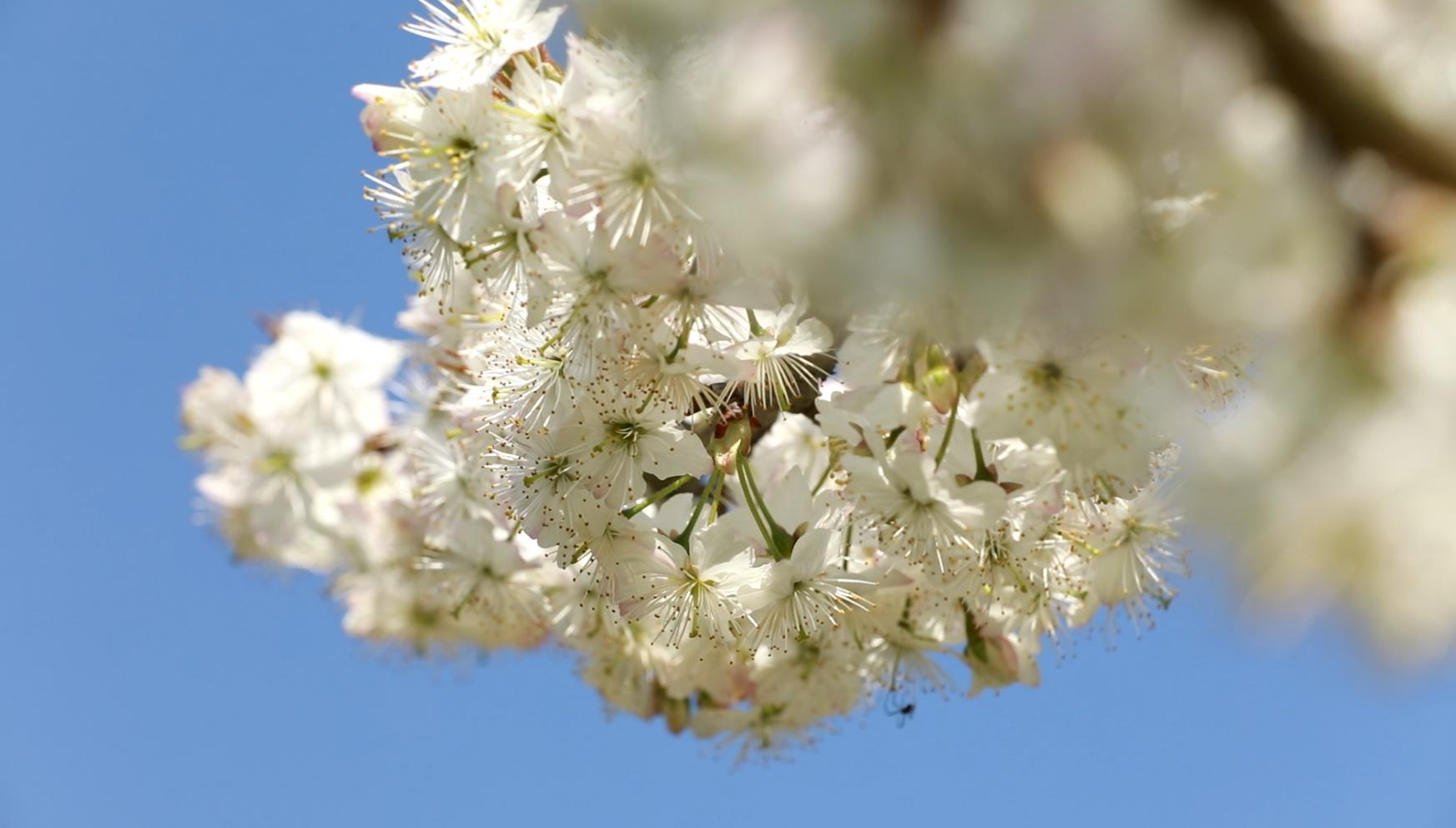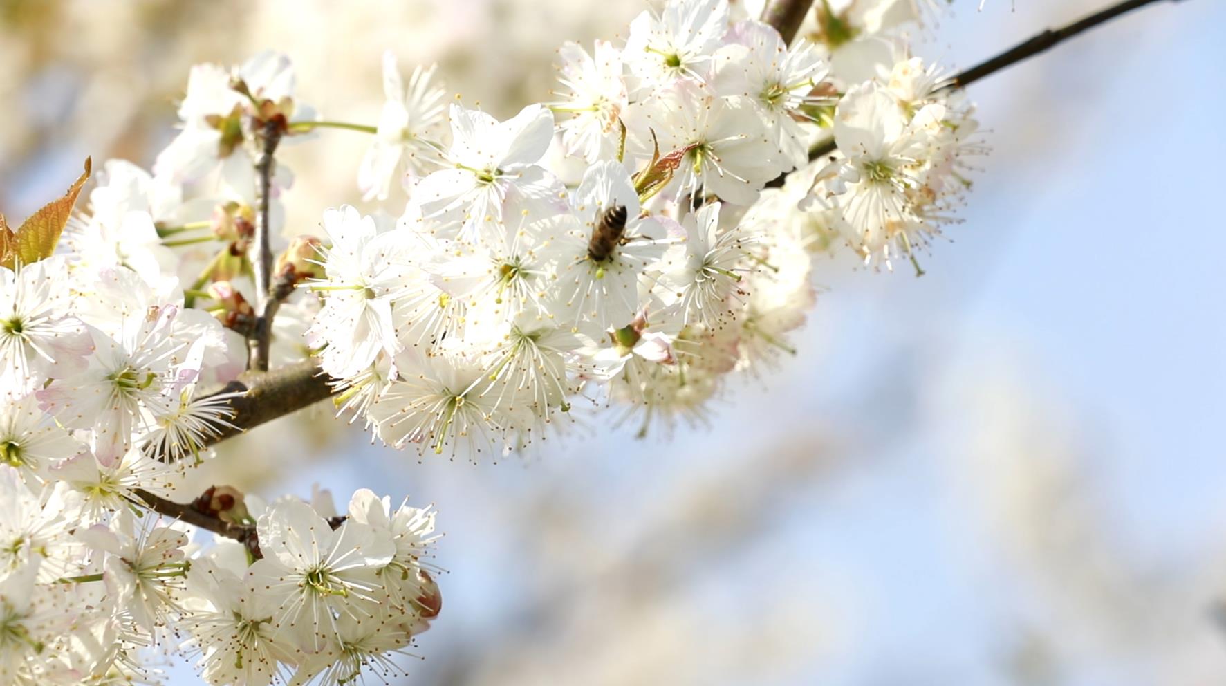樱桃千万枝,照耀如雪天。沿着蜿蜒的山路行至樱桃园,一片片雪白映入眼帘,花林深处,民房错落有致,恍入世外桃源。一树一树的晶莹,一枝一枝的花团,挤挤挨挨,密密匝匝,在蓝天下尽情盛开。花束间,蜜蜂飞舞,蝴蝶翩跹。春日盛景也吸引了不少慕名而来的游人,大家徜徉在花海间,拍照留影,拥抱春光。