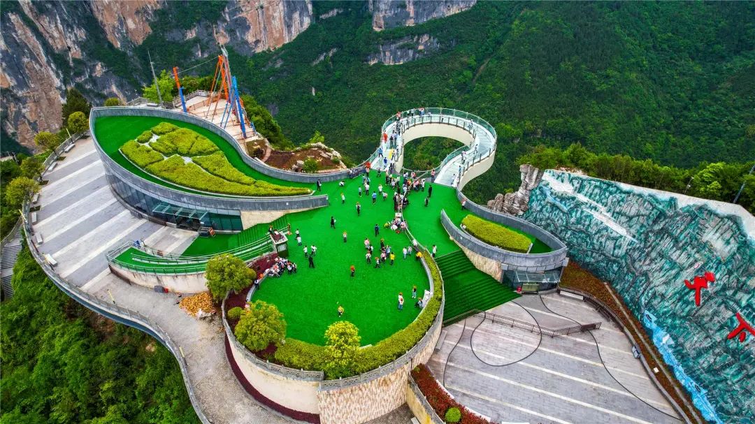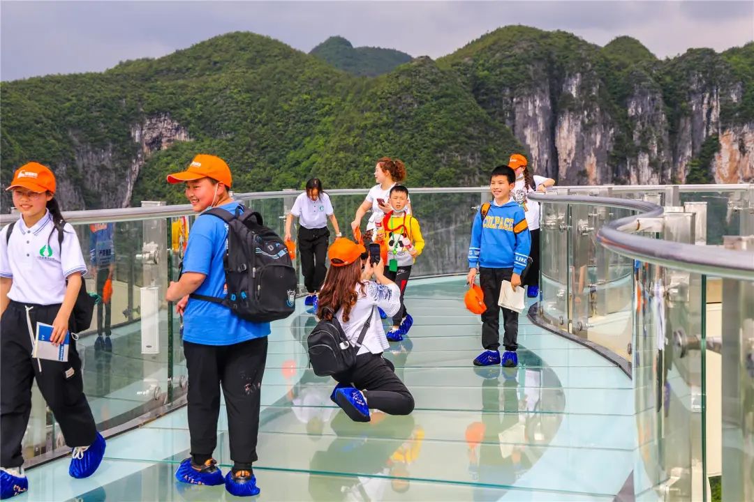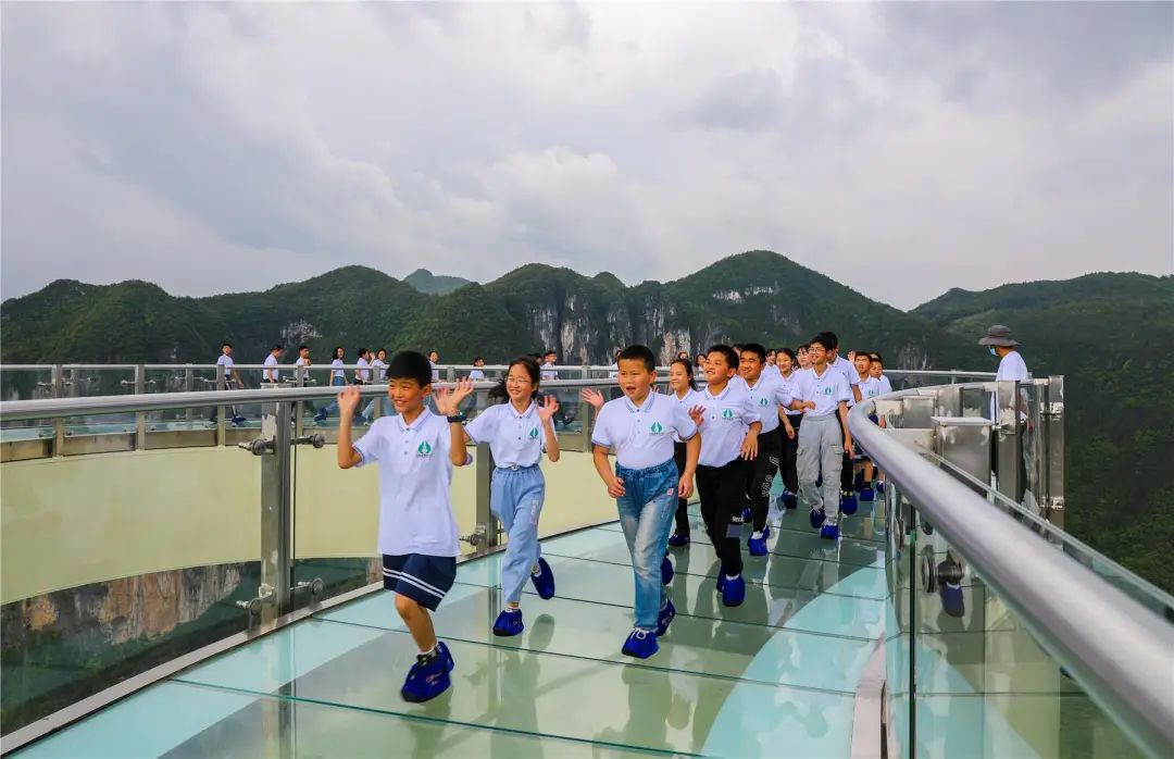 在龙缸景区,来自云阳青龙小学的100余名学生走上云端廊桥,感受步步惊心的刺激,学生们纷纷感慨现代建筑工艺的匠心独到。