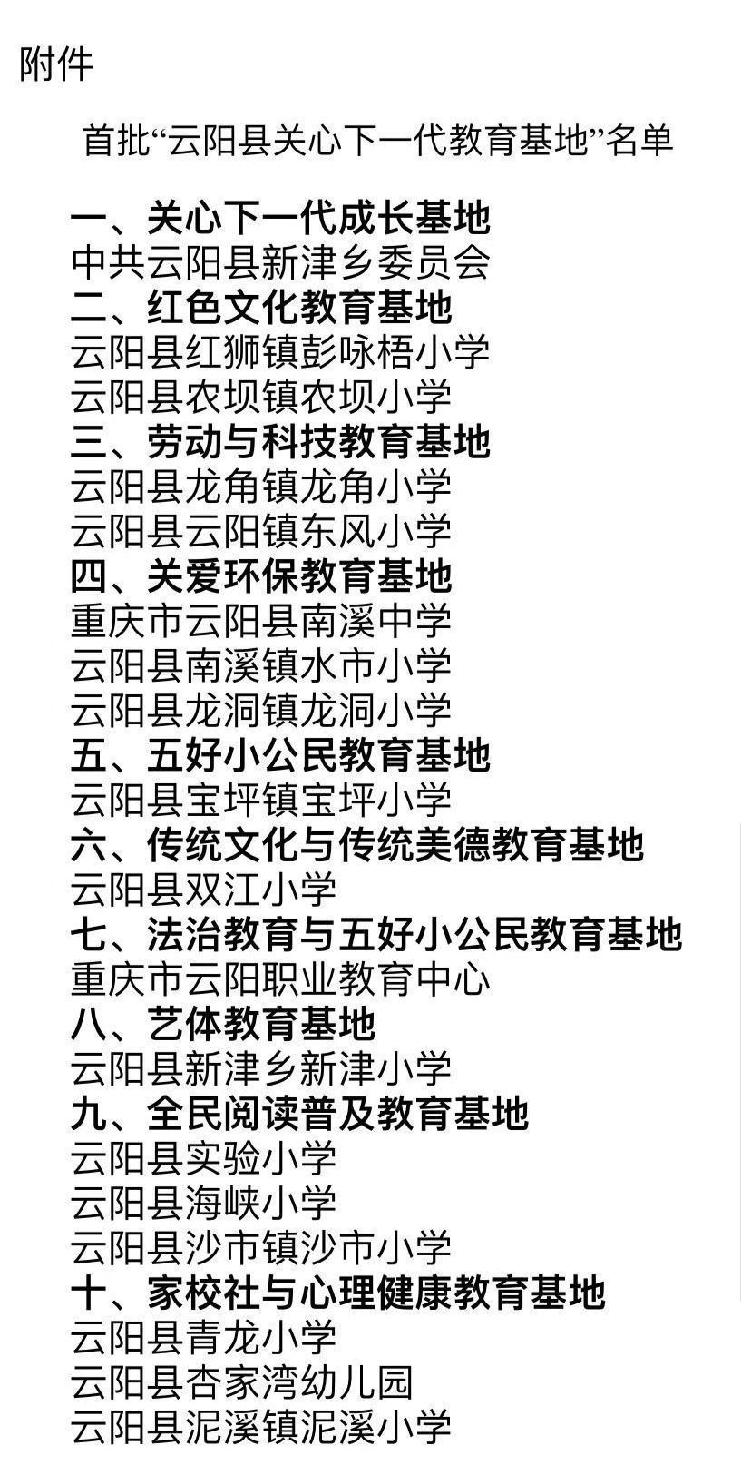 仪式现场,县关工委相关负责人为中共云阳县新津乡委员会、云阳县红狮镇彭咏梧小学、云阳县农坝镇农坝小学等18个教育基地授牌。随后,由新津乡、南溪中学、龙角小学教育基地负责人代表分别作了表态发言。