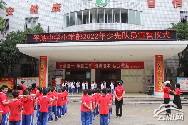 在《红领巾之歌》音乐声中,二、三年级学生代表走上主席台,为新队员佩戴红领巾,并互敬队礼,体现组织的传承意义。鲜艳的红领巾佩戴在新队员胸前时,他们脸上洋溢着激动与自豪。他们举起右手庄严宣誓:“我是中国少年先锋队队员,我热爱中国共产党,热爱祖国,热爱人民,好好学习,好好锻炼,准备着为共产主义事业贡献力量!”新队员的铿锵誓言,在平湖操场上荡漾,充分显示了作为新时代好少年的信心和决心。