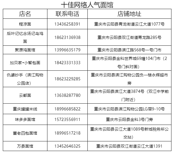 十佳网络人气面馆:程凉面、后叶记忆念汤记乌鸡面、聚原鸡面馆、加贝家•小智包面、仇婆抄手(滨江购物公园店)、云都面、重庆罐罐米线、味多多面馆、董老四包面馆、万县面馆。