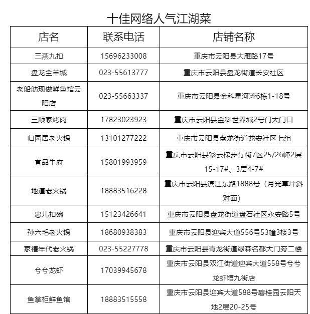 十佳网络人气江湖菜:三蒸九扣、盘龙全羊城、老船舫现做鲜鱼馆云阳店、三顺家烤肉、归园居老火锅、宜品牛府、地道老火锅、忠儿扣碗、孙六毛老火锅、家禧年代老火锅、兮兮龙虾、鱼掌柜鲜鱼馆、老家柴火鸡、蜀鑫鲜鱼馆、楠火锅、淑芬掌中宝串串、城中城老陆毛火锅、玉涵山庄、江源火锅串串、明江烤鱼。