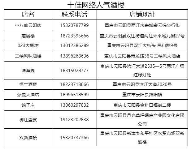 十佳网络人气酒楼:小八仙云阳店、惠居楼、023大橱坊、三峡风味酒楼、味海园、恒生酒楼、弘悦大酒店、鸽子庄、御江盛宴、双新酒楼。