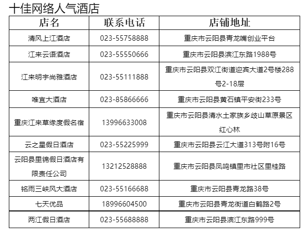 十佳网络人气酒店:清风上江酒店、江来云语酒店、江来明宇尚雅酒店、唯宜大酒店、重庆江来草缘度假名宿、云之星假日酒店、云阳县里锦假日酒店有限责任公司、铭雨三峡风大酒店、七天优品、两江假日酒店。