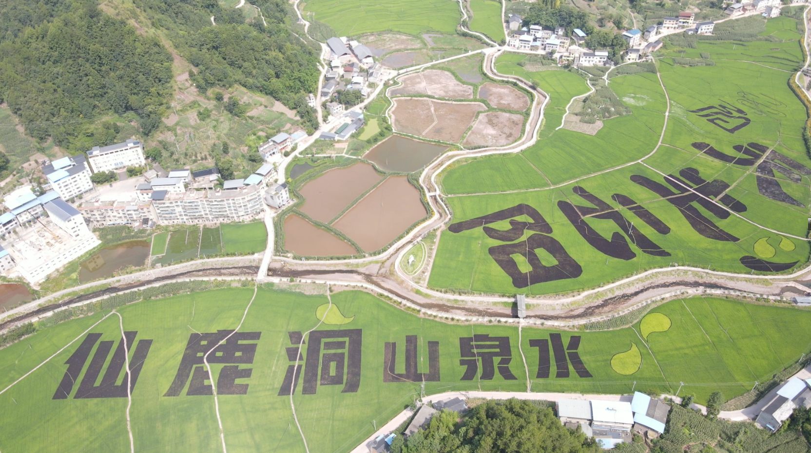 走进洞鹿乡洞鹿坝千亩富锌农业产业园内,放眼望去,1000多亩五彩稻田尽收眼底,其中100多亩是由五彩水稻种植形成的巨幅稻田画。巨大的稻田中,一只仙鹿图像栩栩如生引人注目。围绕仙鹿图像,“天生云阳”“乡村振兴”“仙鹿洞山泉水”等字样清晰可见。